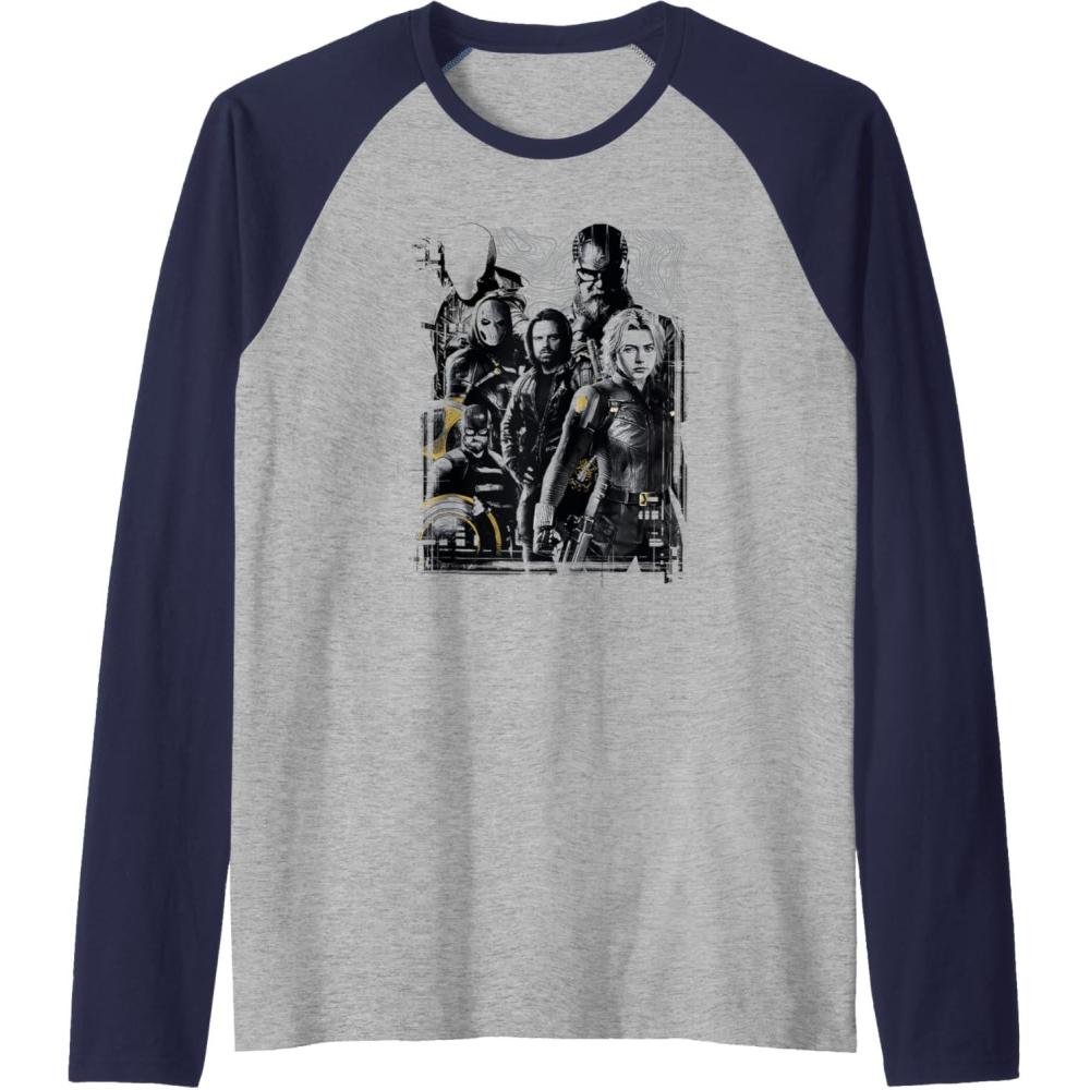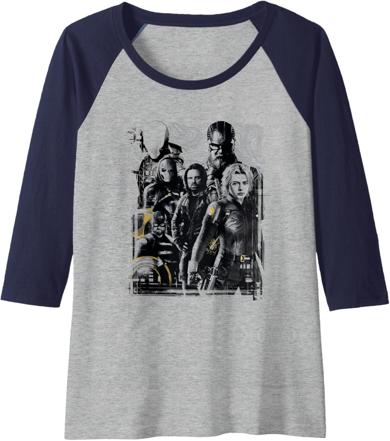 Marvel Thunderbolts Topographic Map Group Shot Raglan Baseball Tee(Black/Athletic Heather)