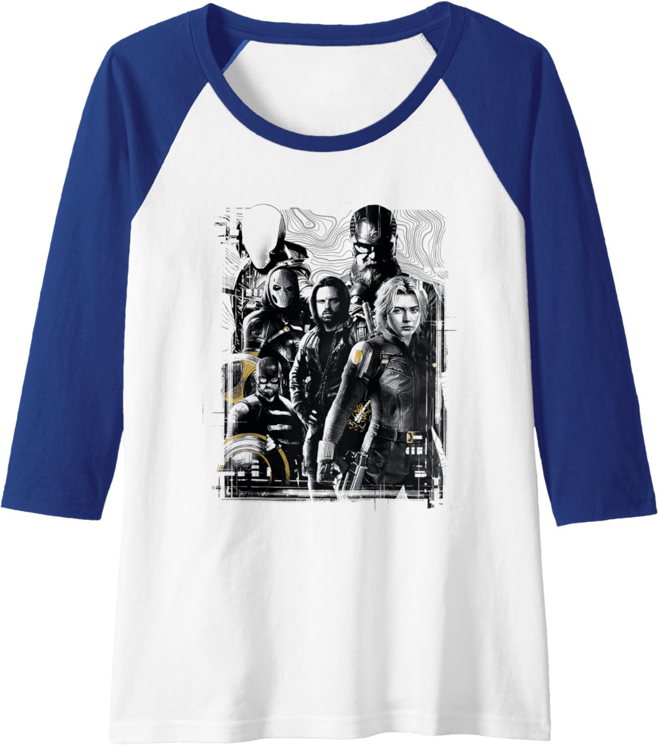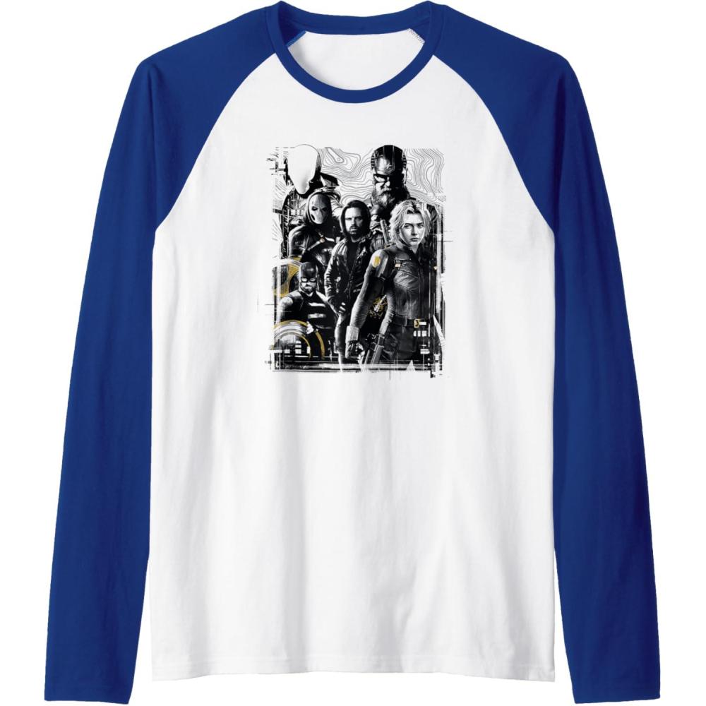 Marvel Thunderbolts Topographic Map Group Shot Raglan Baseball Tee(Royal Blue/White)