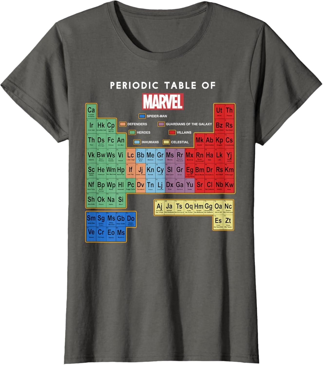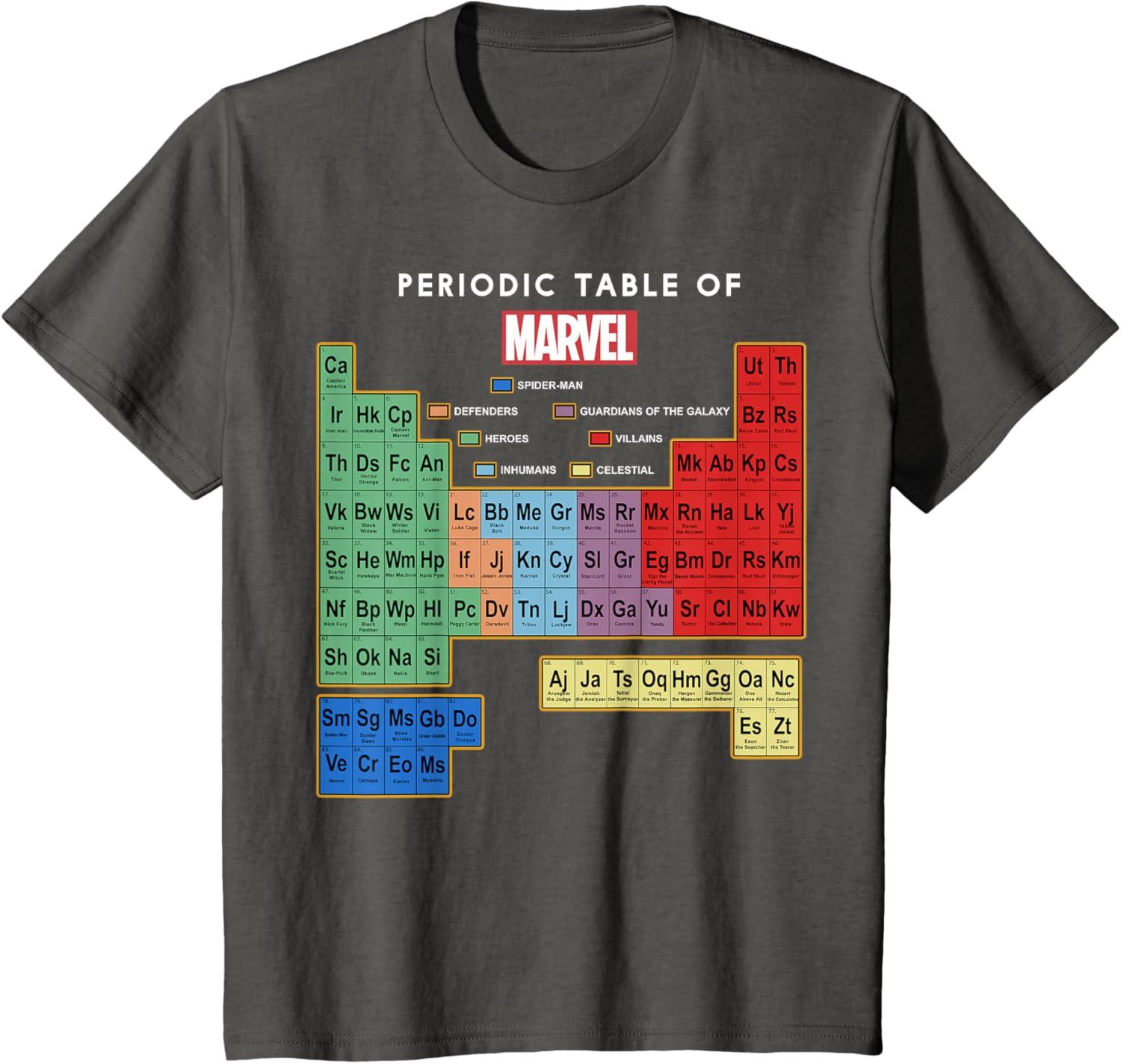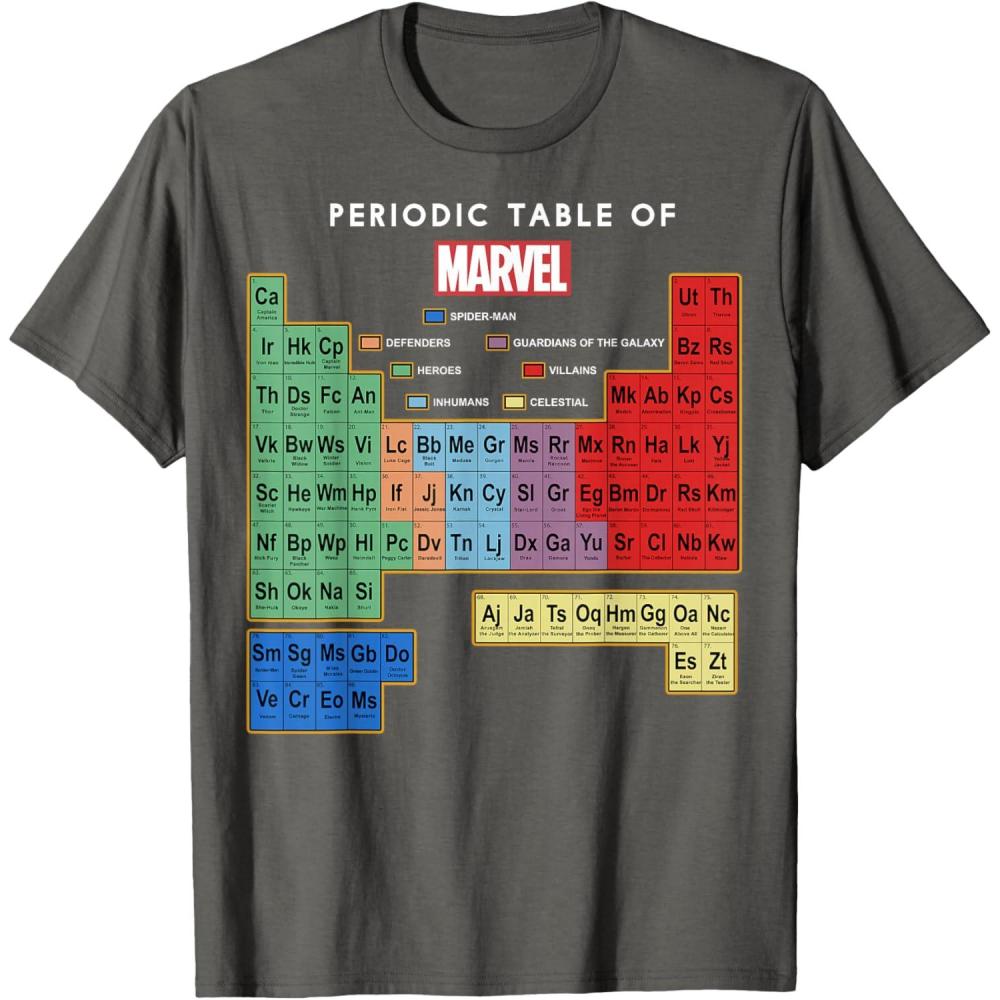 Marvel Ultimate Periodic Table Of Elements Graphic Short Sleeve T-Shirt, Black, Small(Asphalt Grey)