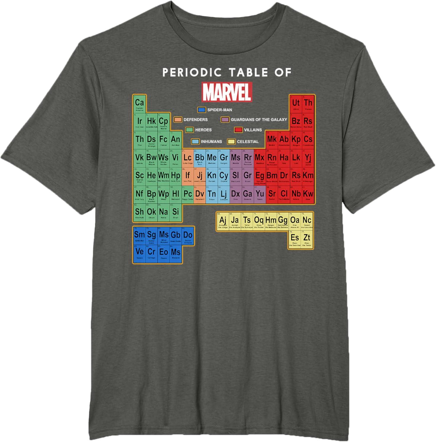 Marvel Ultimate Periodic Table Of Elements Graphic Short Sleeve T-Shirt, Black, Small(Heather Blue)