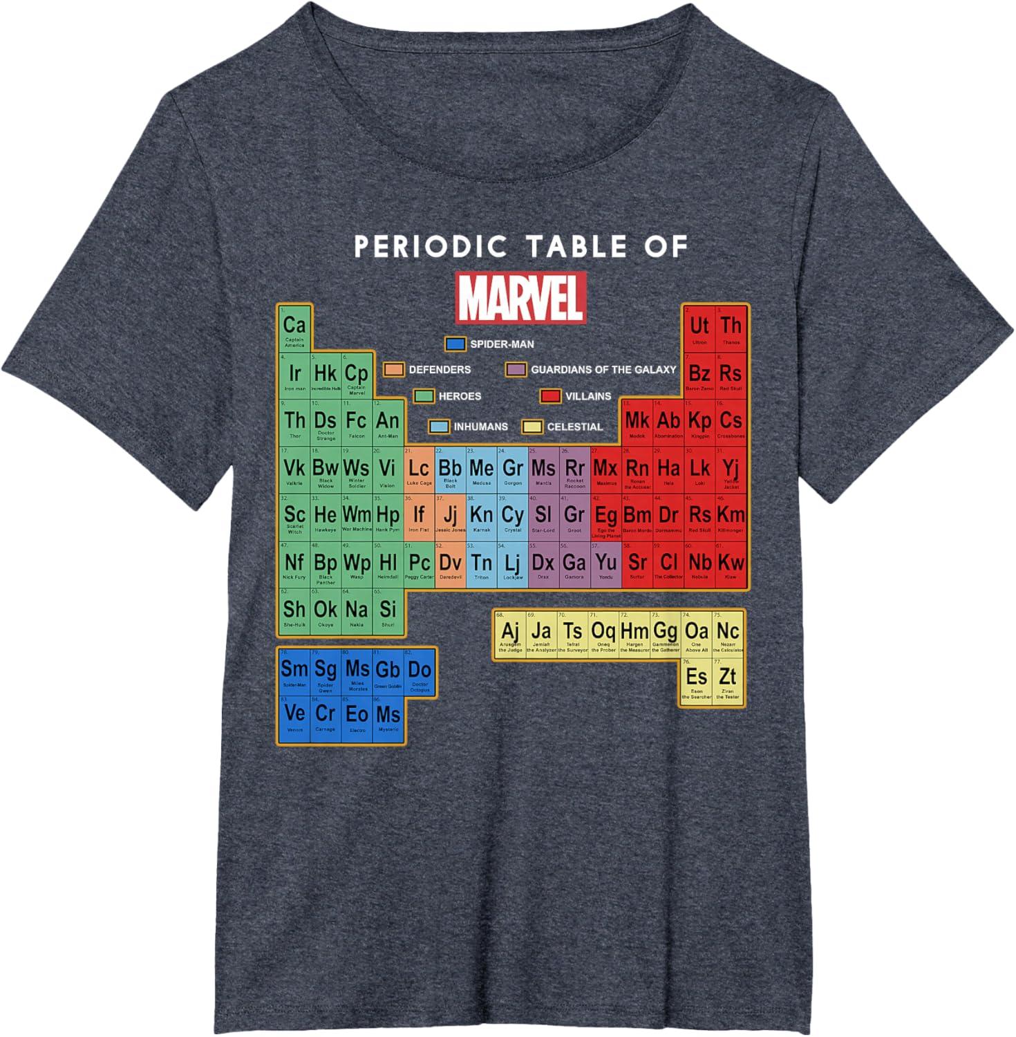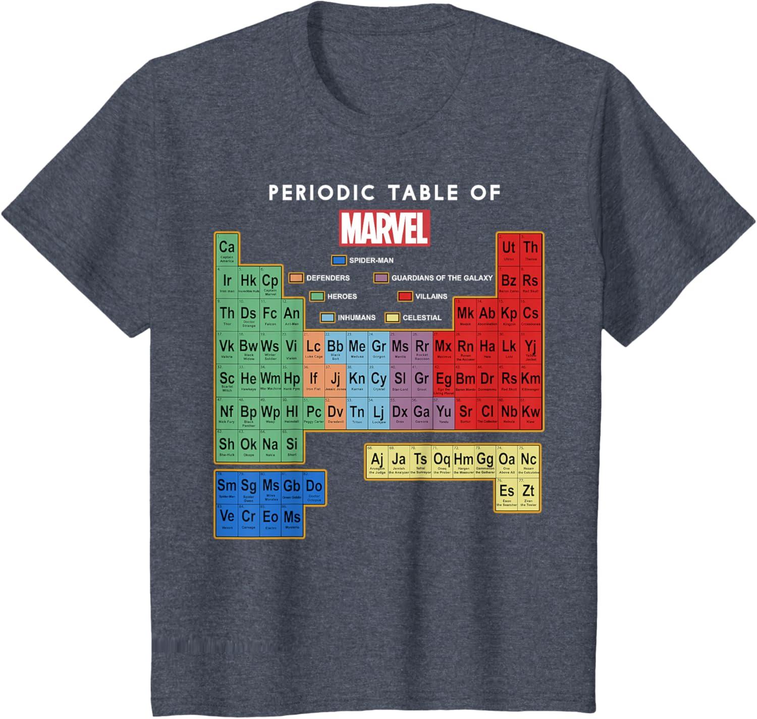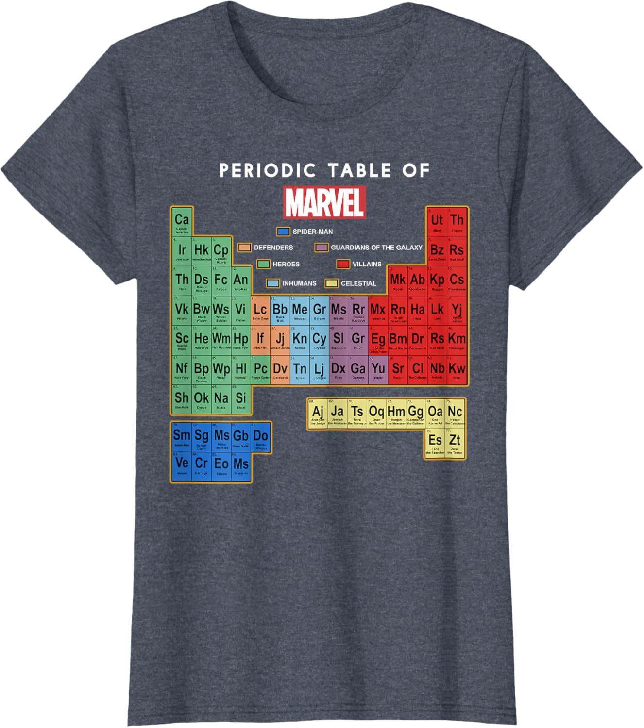 Marvel Ultimate Periodic Table Of Elements Graphic Short Sleeve T-Shirt, Black, Small(Heather Blue)