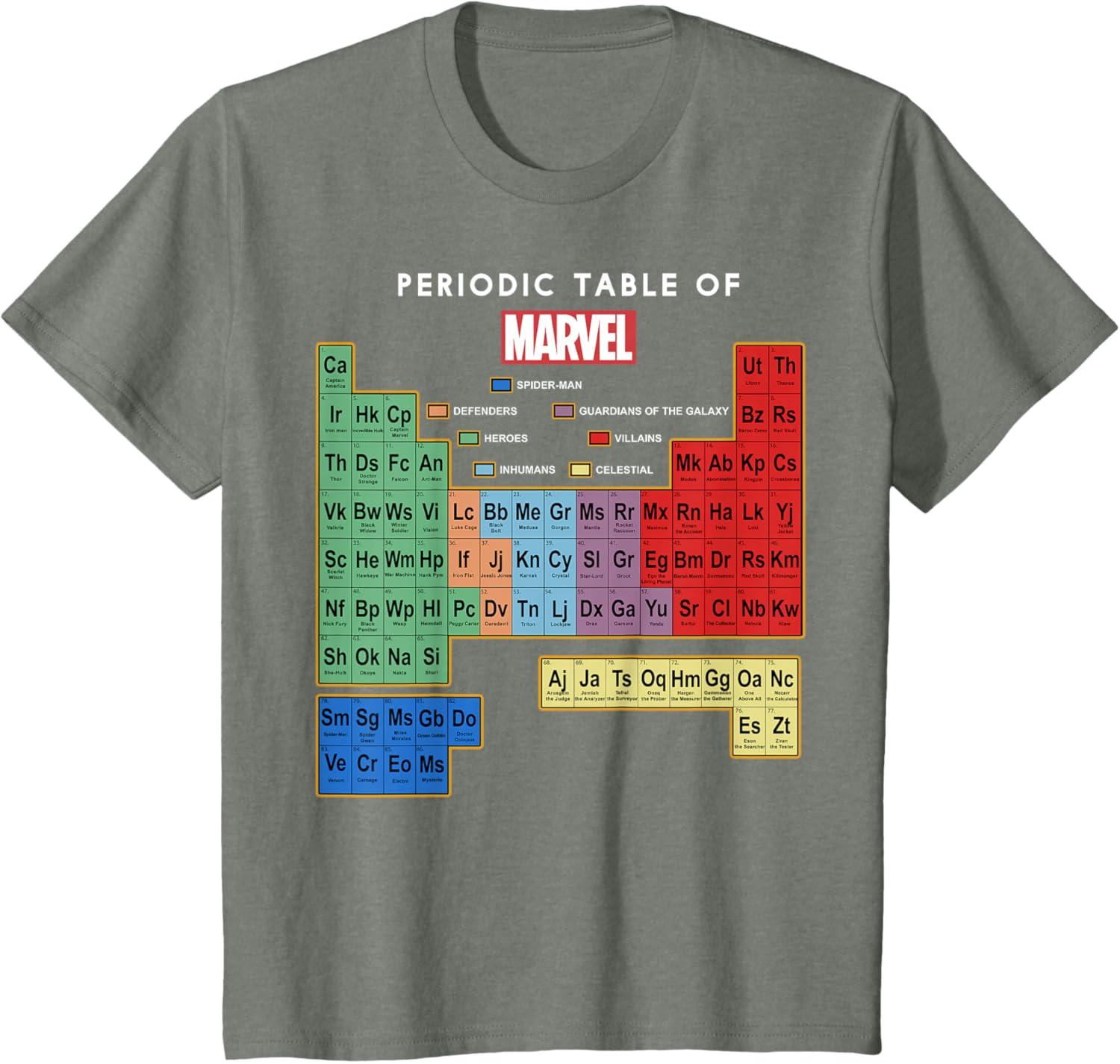 Marvel Ultimate Periodic Table Of Elements Graphic Short Sleeve T-Shirt, Black, Small(Olive Heather)