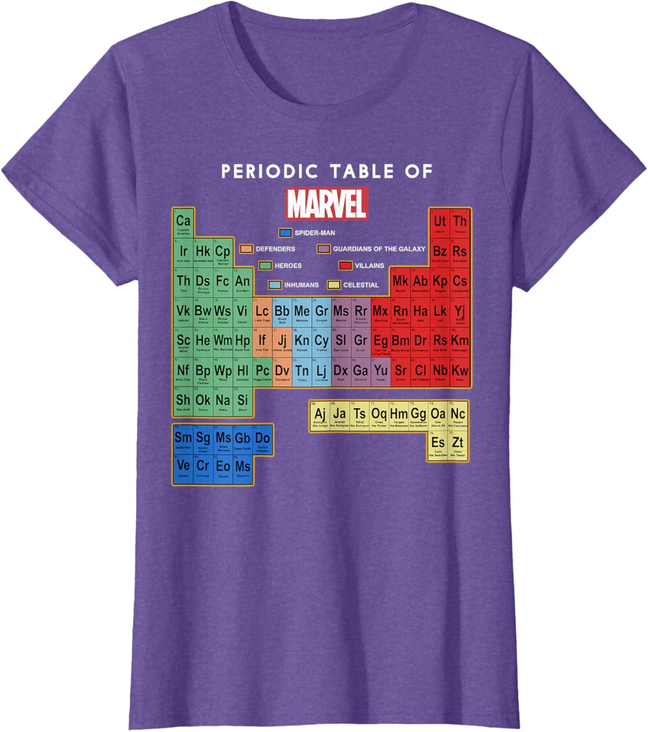 Marvel Ultimate Periodic Table Of Elements Graphic Short Sleeve T-Shirt, Black, Small(Purple Heather)