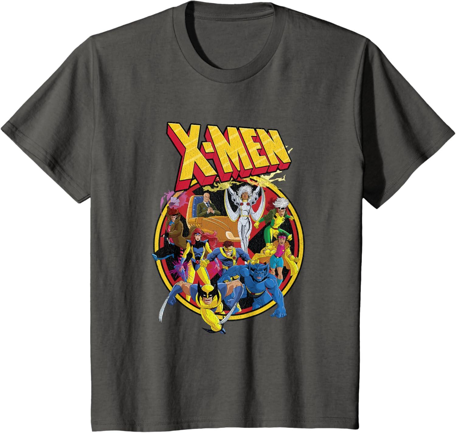 It'll always be Saturday morning when you don this retro X-Men shirt. It features your favorite mutant Super Heroes including Beast, Jubilee, Storm, Wolverine, Jean Grey, Professor X, Gambit, Rogue, and Cyclops with the iconic X-Men animated series logo. With distressed artwork from the 90s cartoon, this retro Marvel shirt makes a powerful addition to your wardrobe.