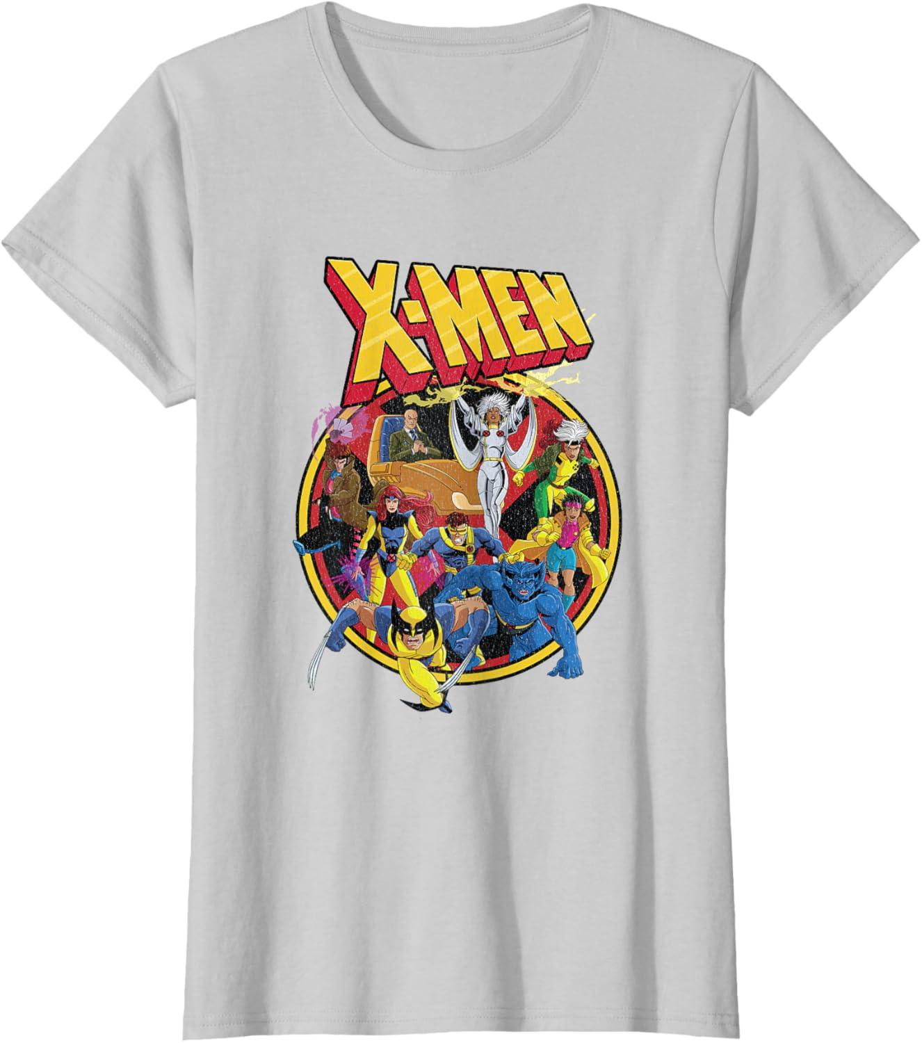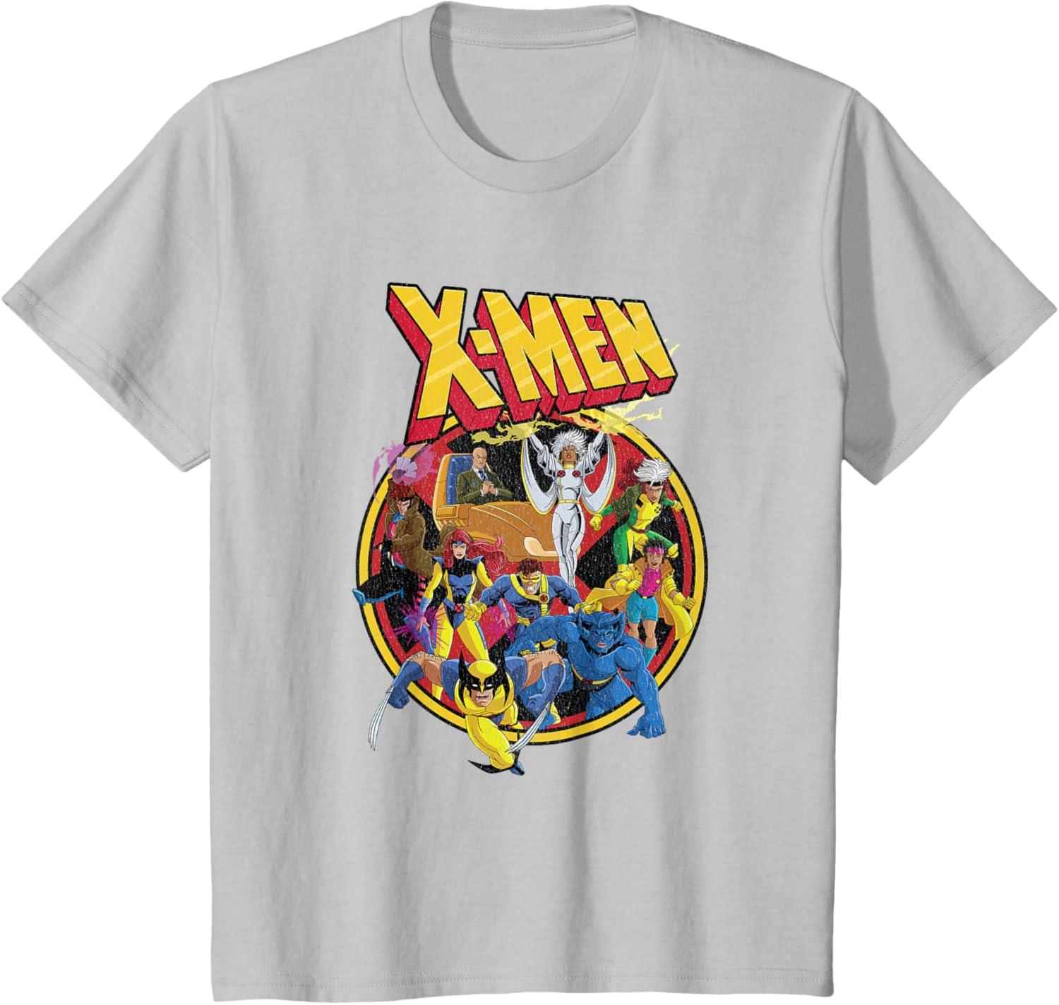 It'll always be Saturday morning when you don this retro X-Men shirt. It features your favorite mutant Super Heroes including Beast, Jubilee, Storm, Wolverine, Jean Grey, Professor X, Gambit, Rogue, and Cyclops with the iconic X-Men animated series logo. With distressed artwork from the 90s cartoon, this retro Marvel shirt makes a powerful addition to your wardrobe.