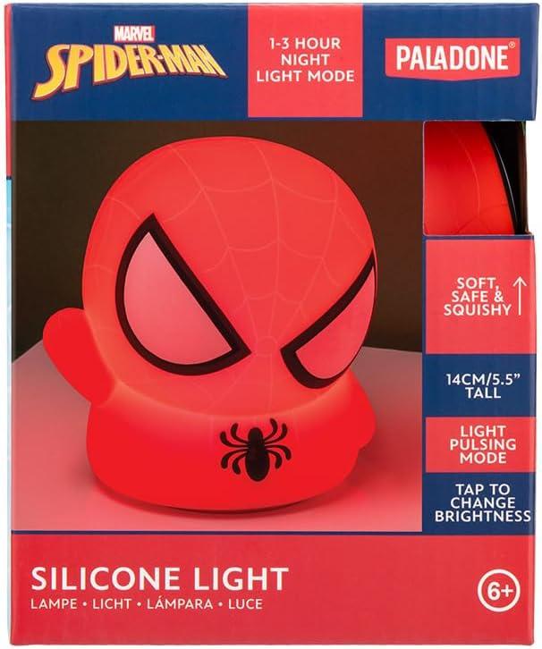Squishy Spider-Man: Meet your new light-up companion. The Spider-Man SquishyGlo Silicone Light has a soft, squishy texture. Simply tap Spidey to turn on or change the brightness.