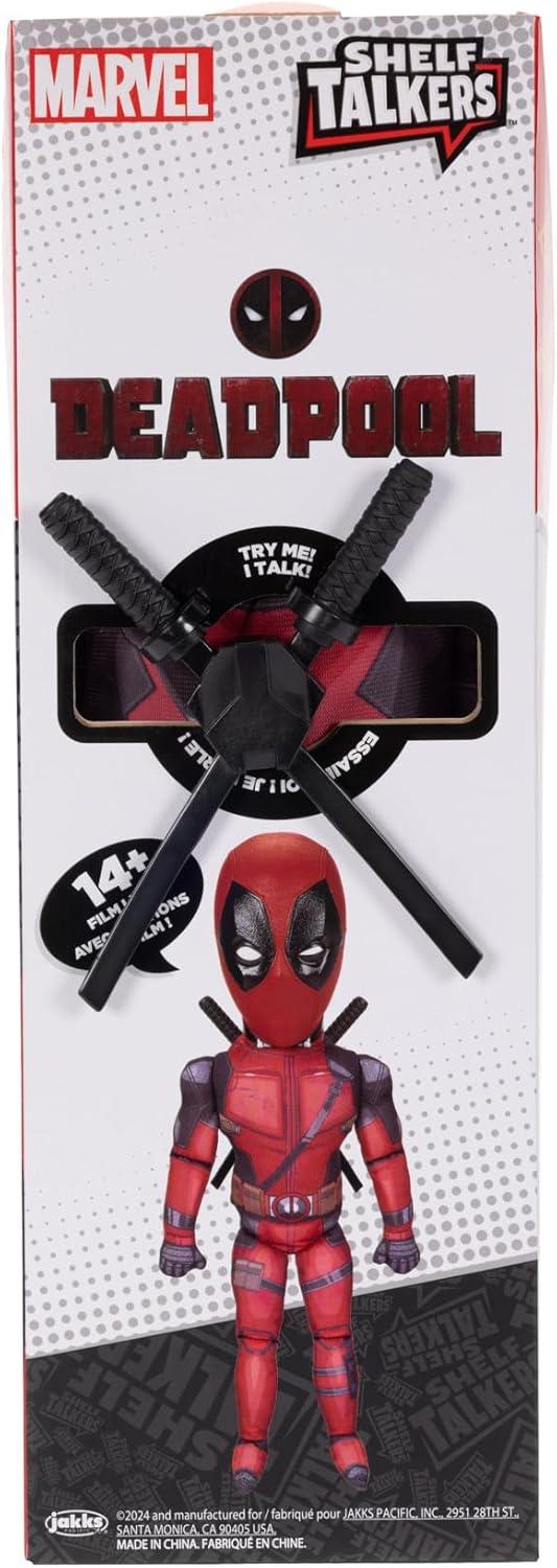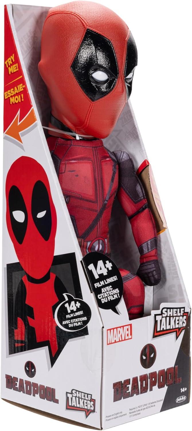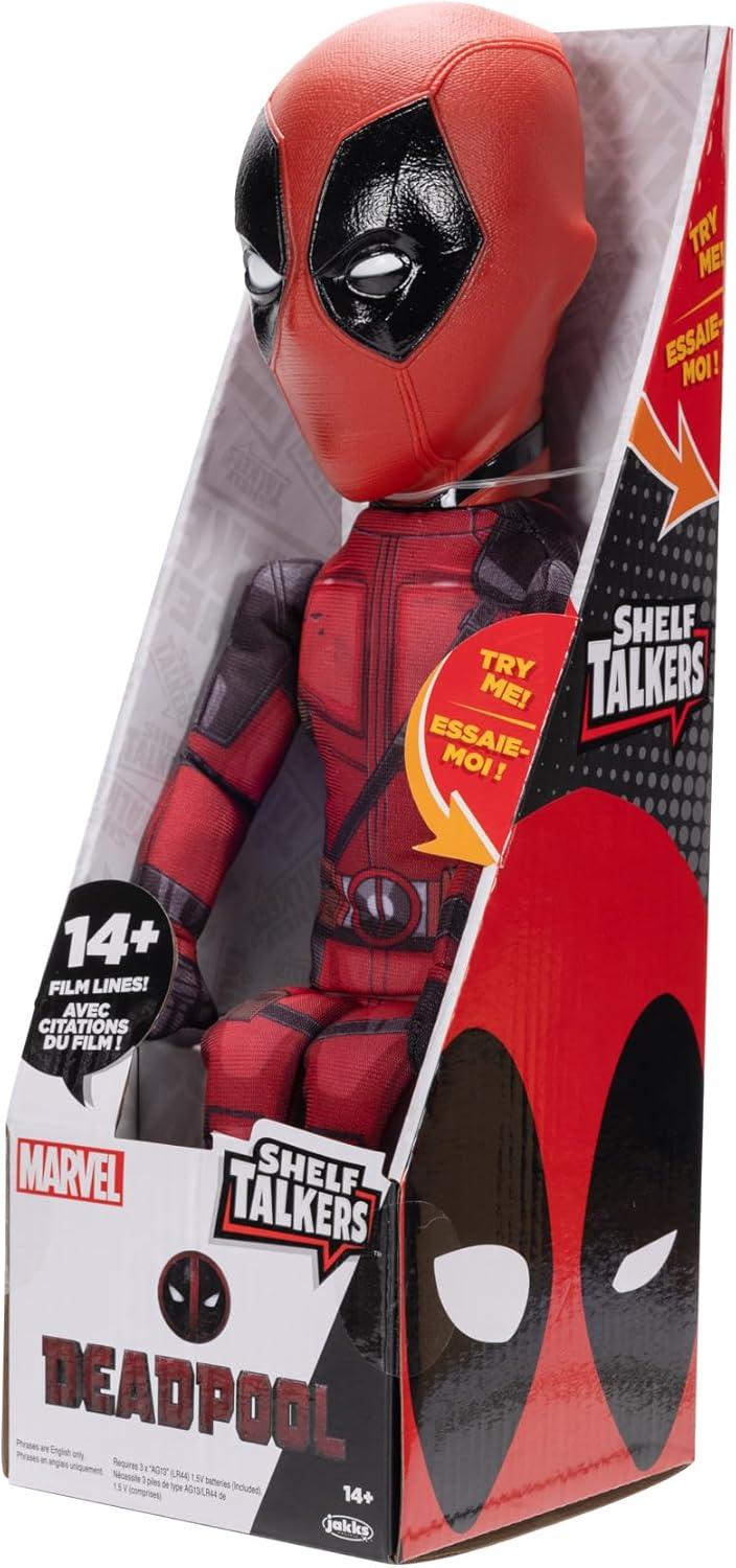 Oh, hello there. It’s me, the Marvel Deadpool Shelf Talker.I’m here to break the fourth wall again to remind you that you may remember me from such classic films like Deadpool and Deadpool 2. Now get ready to see me, the merc with a mouth on a shelf near you. You thought these swords only had one purpose? Well, guess again because when you pull on these, it will activate some of my memorable lines from the films. I may be a little hard-headed, but my body is made from a soft plush fabric and features my classic red and black suit that you’ve all come to love. In case I ever stop talking, just replace the batteries and I’ll be back to saying my lines again in no time. You can now enjoy your very own Marvel Deadpool Shelf Talker at home. I may be super but I’m hero. I do make the perfect gift for any fan though. Ages 14+. Phrases are in English only. Collect all the Shelf Talkers today! (Each sold separately)