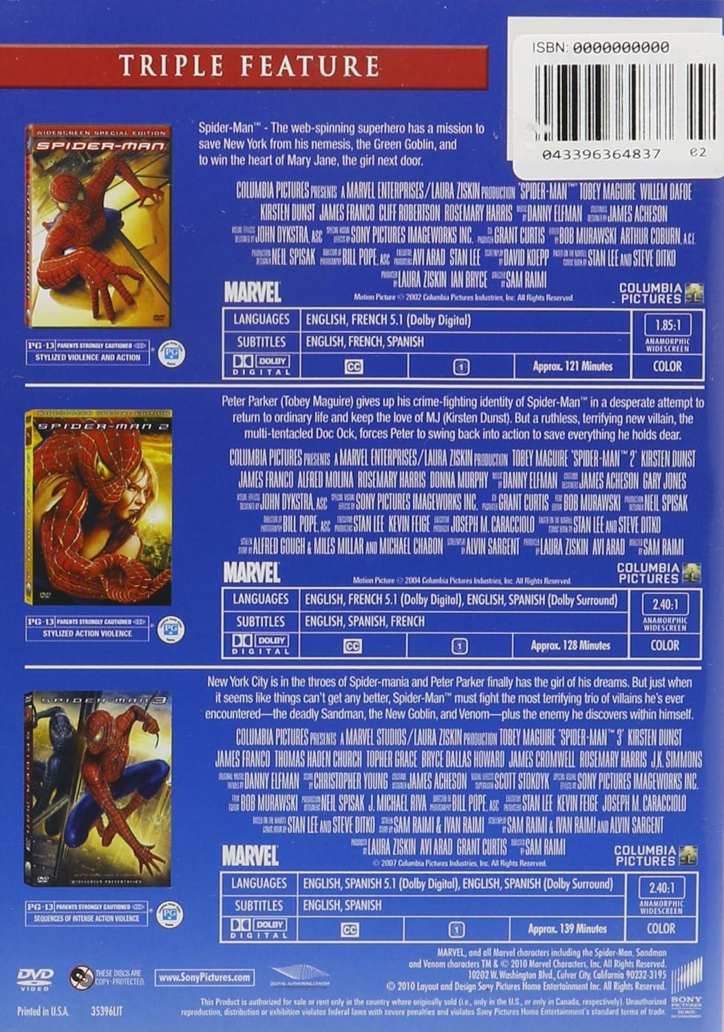 The “Spider-Man” trilogy features the three critically- acclaimed “Spider-Man” films directed by Sam Raimi. Follow Peter Parker (Tobey Maguire) in these three adventures as he swings into action fighting super-villains Green Goblin, Doc Ock, Sandman and Venom and wins the heart of Mary Jane (Kirsten Dunst).