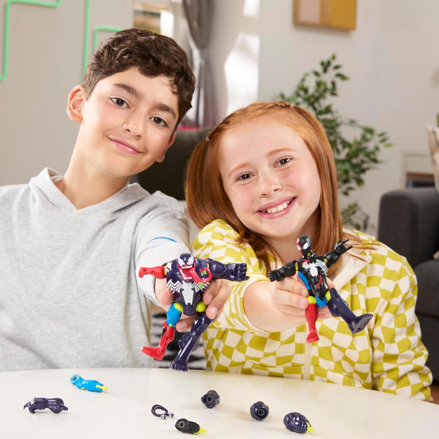 INCLUDES 2 BODIES & 7 PIECES: This Marvel action figure set comes with a custom purple Venom body, Venomized Spider-Man body, and 7 pieces, including stretchy symbiote heads, alternate hand, and web accessories