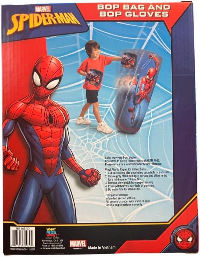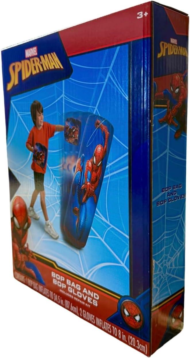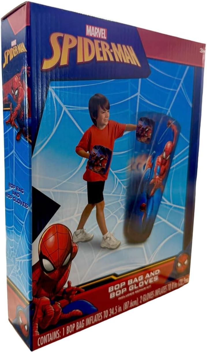 Box till you drop with your kids. Spiderman Bop Bag and Gloves promotes exercise, fitness, teaches discipline, and basic hand-to-hand combat skills that kids can use to protect themselves from physical threats. This product is a great way to encourage your little one to exercise and use their imagination to pretend play they are defeating the most notorious super villains of Marvel Universe! Your little superhero can fight villains and save the day with the Marvel Spiderman Punching Bop Bag and Bop Gloves! Kids will love pretending they are training with their favorite superhero with this durable punching bag and gloves. Throw some jabs, hooks, uppercuts, or a mix of kicks and punches for more intense kickboxing or wrestling pretend play. Perfect gift or party favor for energetic kids. Kids who love Marvel superheroes like Spiderman would love to learn how to fight like their favorite hero. Perfect exercise equipment for little kids to play indoors or outdoors. Requires small space, soft and easy to store when not in use. A fun toy to enjoy while developing physique and skills such as hand-eye coordination, speed, and agility. Includes 1 set of Spiderman Inflatable Bop Bag with a pair of Inflatable Bop Gloves. The kit comes with a repair kit in case of rips or tears. Fill the bottom chamber with water or sand to keep in the Spiderman bop bag in an upright position. Marvel Spiderman Inflatable Bop Bag and Gloves Set is a cute punching bag for kids, made of premium quality materials. Crafted with inflatable, durable but soft construction to protect your little one's knuckles. The bop bag is weighted on the bottom by water or sand so it will always spring back up after impact ensuring hours of fun! When not in use, deflate or drain the punching bag and gloves store the set. The bop punching bag measures about 34.5″ inches when fully inflated while the gloves inflate to 8″ inches, perfect size for children's little hands. Recommended for boys and girls age 3 and up.