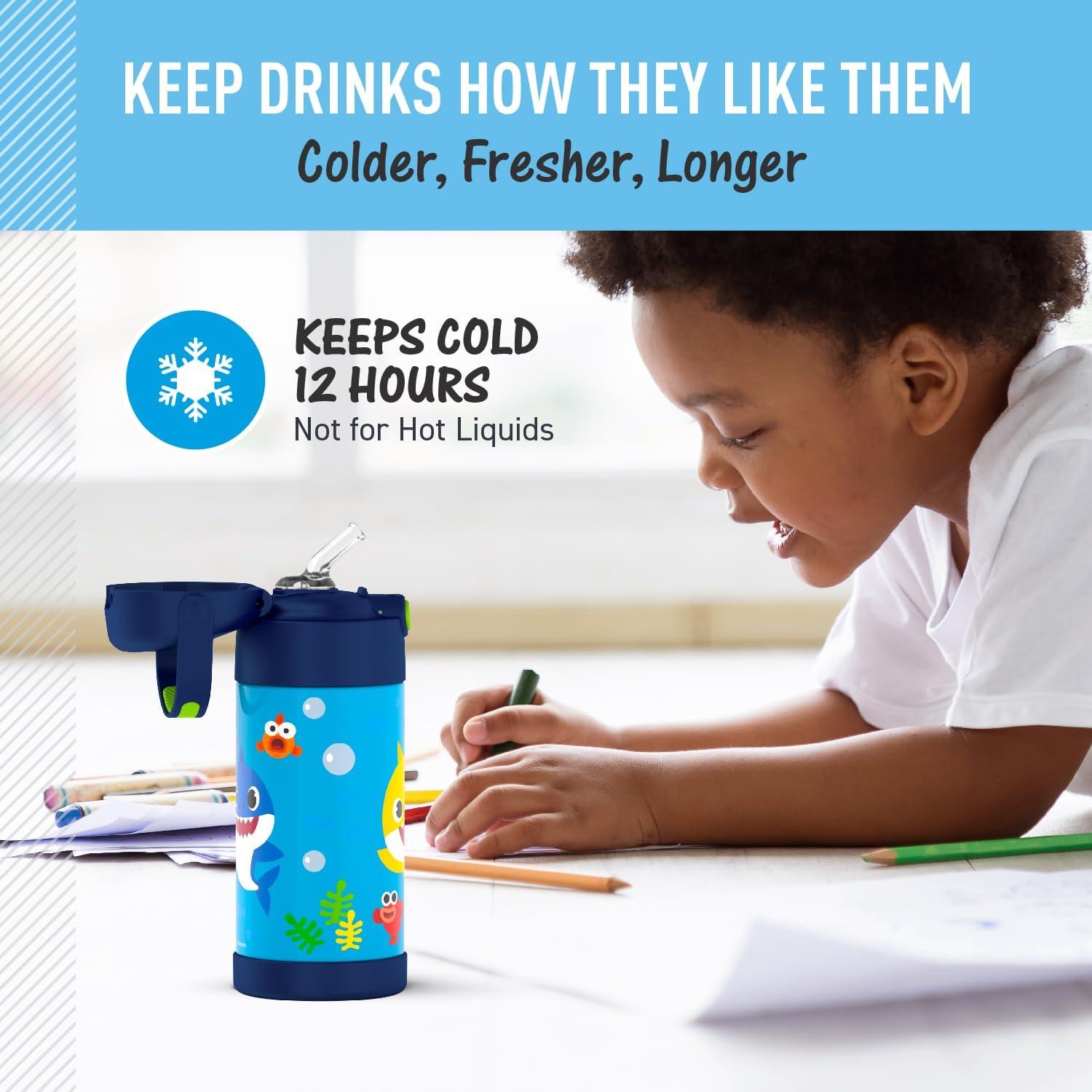 THERMOS FUNTAINER Water Bottle with Straw – 12 Ounce – Kids Stainless Steel Vacuum Insulated Water Bottle with Lid, Spider-Man(Baby Shark)