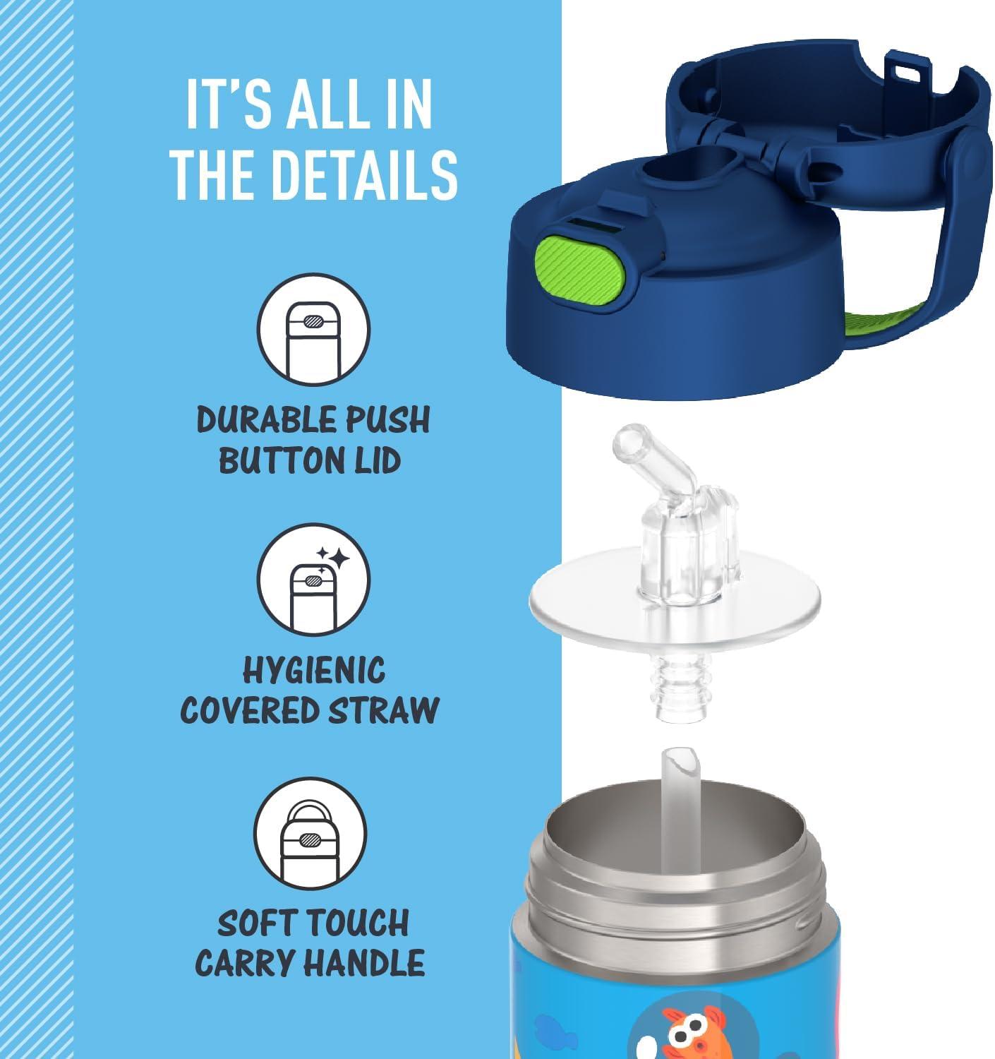 The FUNtainer® 12oz Vacuum Insulated Stainless Steel Water Bottle with Straw keeps drinks cold for up to 12 hours. Our kids water bottles are built so their drinks are as cool on the inside as they look on the outside. Kids stay hydrated and parents stay happy. The double wall stainless steel construction is built to handle drops, dings and assorted roughhousing. Includes an integrated carry handle with soft-touch grip, making it easy for kids to carry with them throughout the day. Includes a hygienically covered silicone straw which is removable for easy cleaning. To clean, you can pop your FUNtainer water bottle in the dishwasher; however hand washing is recommended. Not for use with hot liquids.