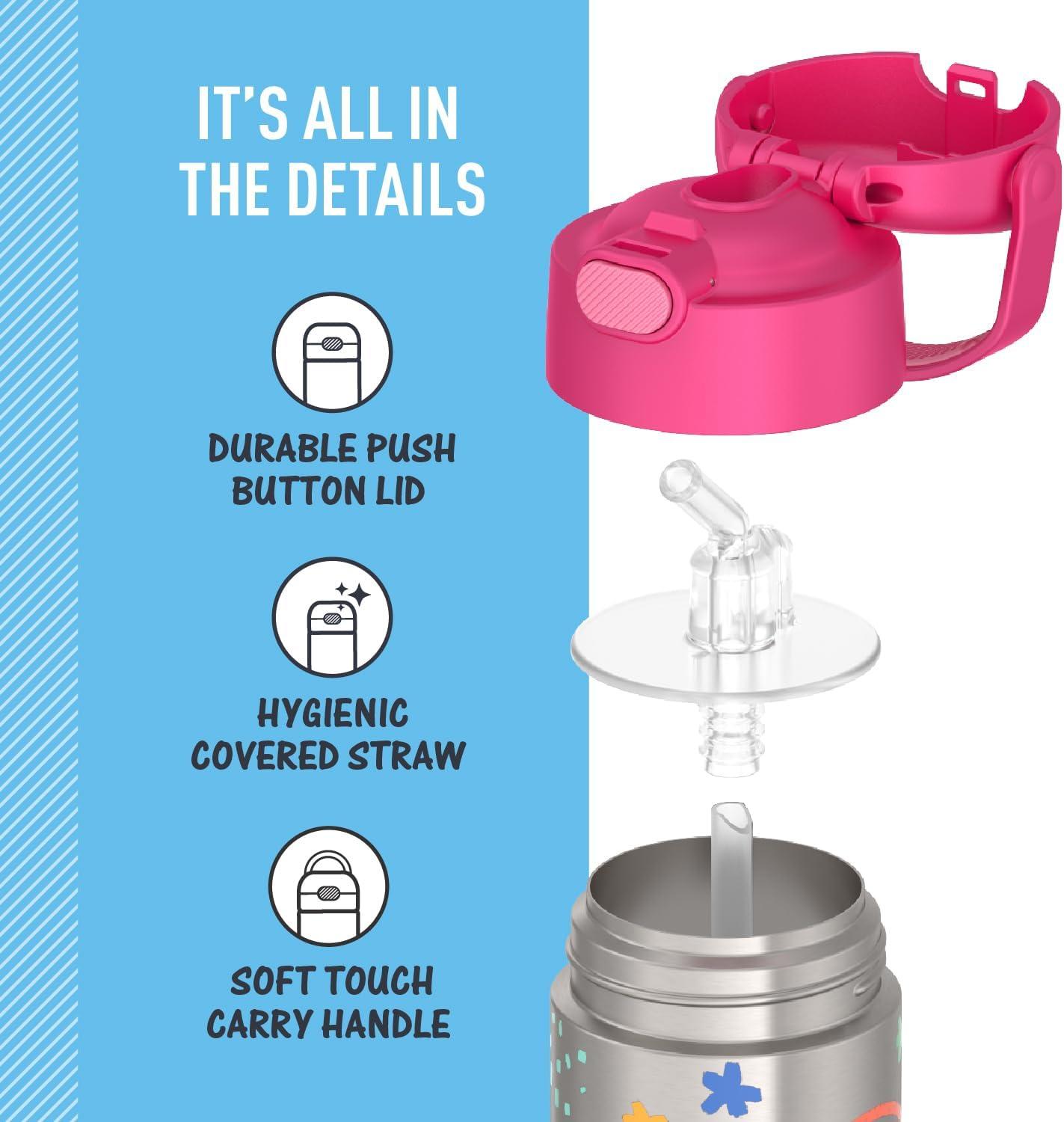 The FUNtainer® 12oz Vacuum Insulated Stainless Steel Water Bottle with Straw keeps drinks cold for up to 12 hours. Our kids water bottles are built so their drinks are as cool on the inside as they look on the outside. Kids stay hydrated and parents stay happy. The double wall stainless steel construction is built to handle drops, dings and assorted roughhousing. Includes an integrated carry handle with soft-touch grip, making it easy for kids to carry with them throughout the day. Includes a hygienically covered silicone straw which is removable for easy cleaning. To clean, you can pop your FUNtainer water bottle in the dishwasher; however hand washing is recommended. Not for use with hot liquids.