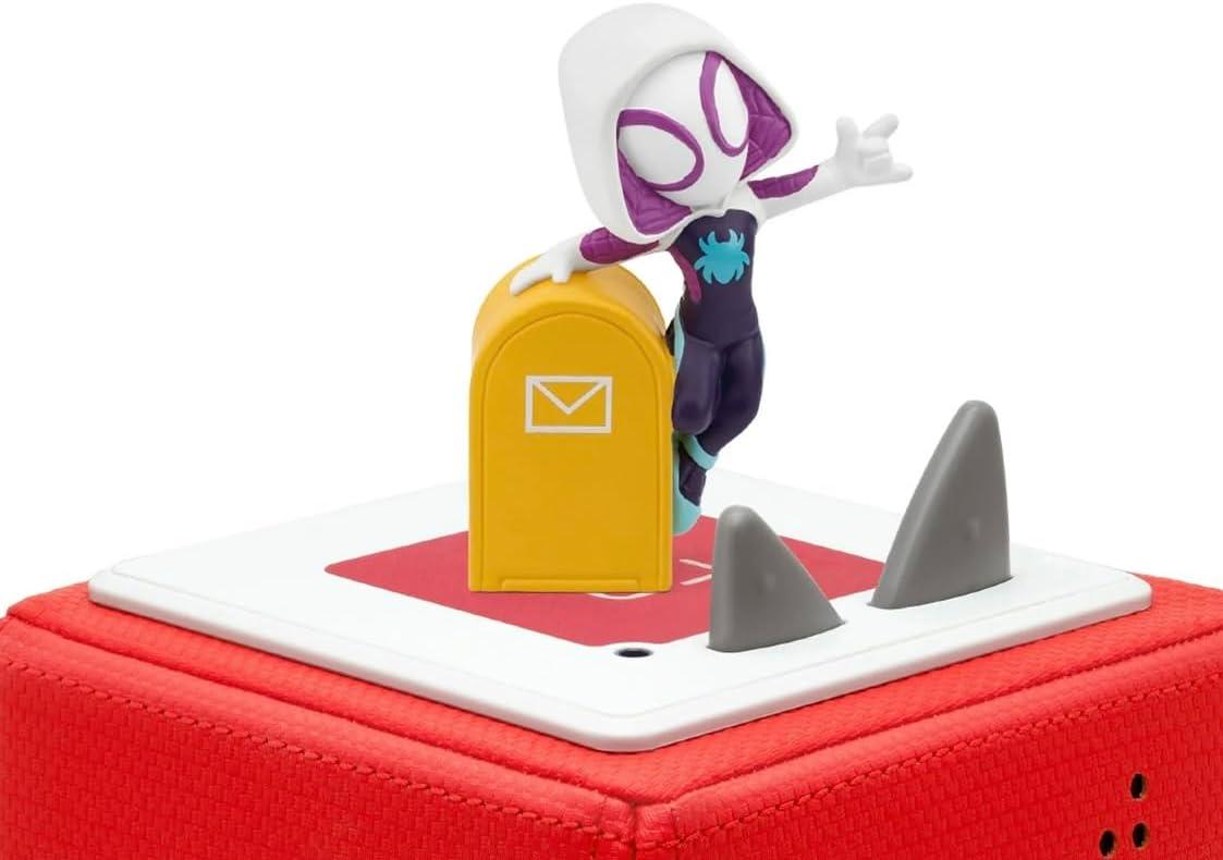 Bundle includes a red Toniebox 1, charging station, Spidey, Ghost-Spider, and Spin Tonies. Additional Tonies can be purchased separately.