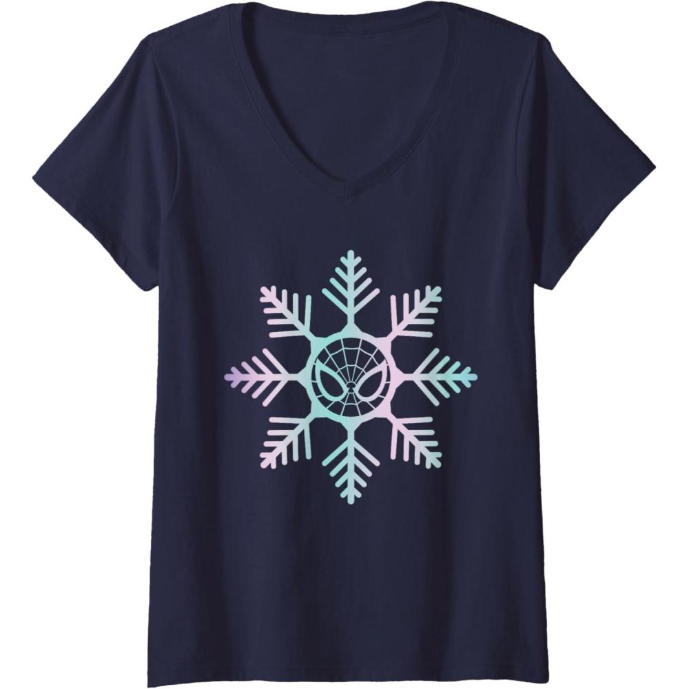 Womens Marvel Spider-Man Winter Holiday Snowflake Logo V-Neck T-Shirt(Navy Blue)