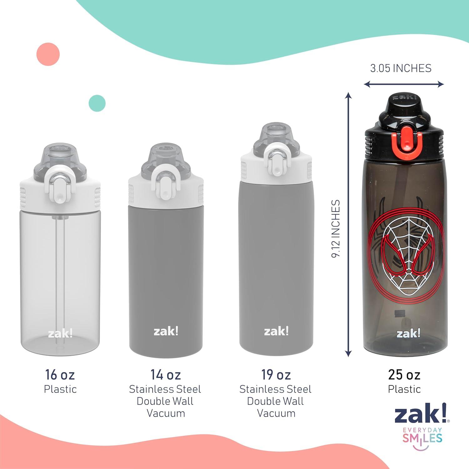 Let kids enjoy hydration with a fun water bottle from Zak Designs, featuring Marvel's Spider-Man! Reusable and Durable Material This reusable bottle will last wash after wash; good for you and good for the environment! The 16 oz. water bottle is made of PP plastic, durable enough for kids to use every day. Leak-Proof Lid The lid screws on securely and won't leak when the spout is closed. The easy-open button has a flip-up lock to keep it from activating accidentally. On the Go The water bottle has a built-in carrying loop on the lid for easy transportation, and with the spout cover to keep the spout clean and closed, it can be tossed into a bag for worry-free travel. Care and Use The bottle is dishwasher safe and should not be microwaved. Recommended for children ages 3 and up. By Zak Designs, making mealtime fun!